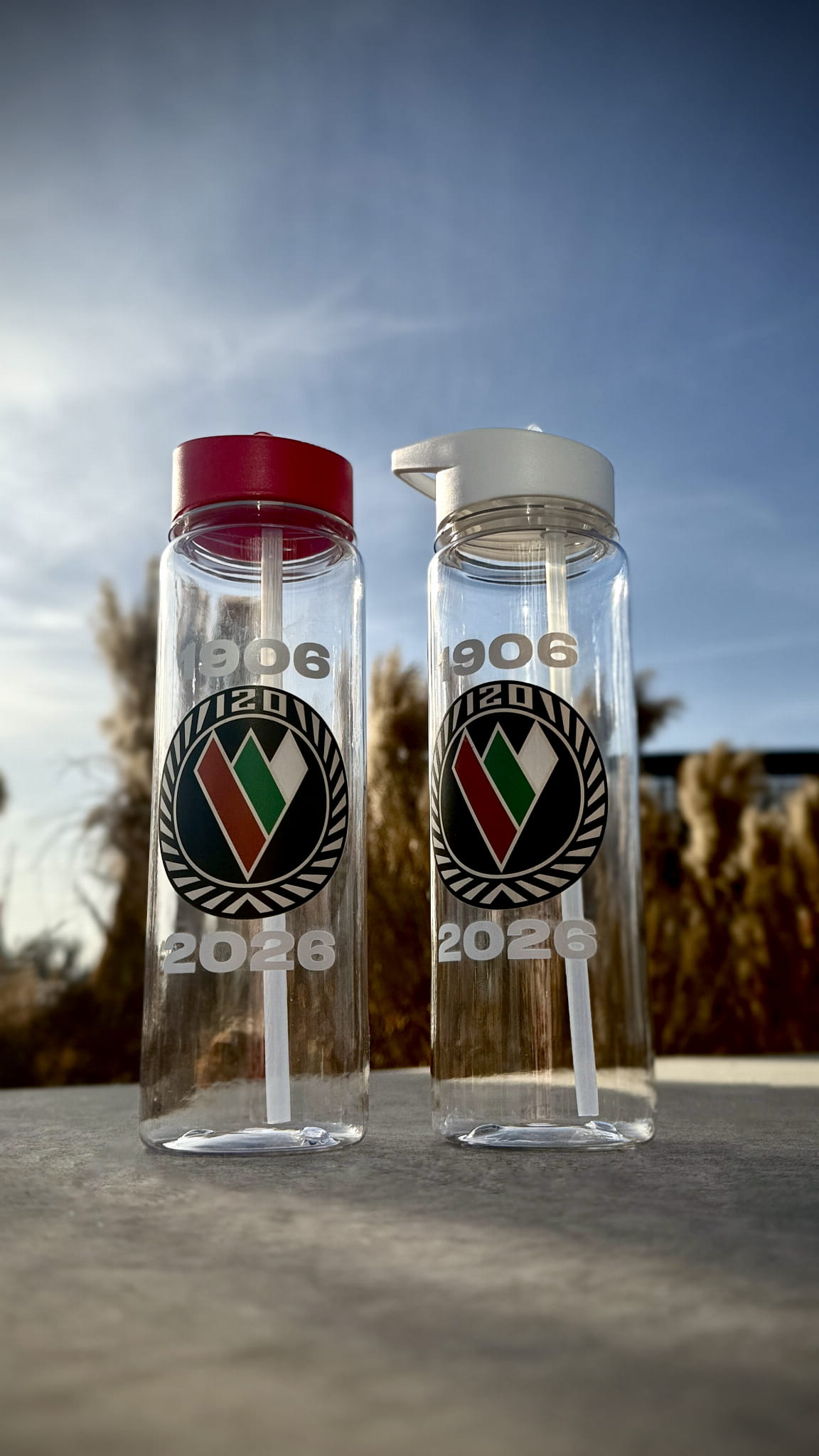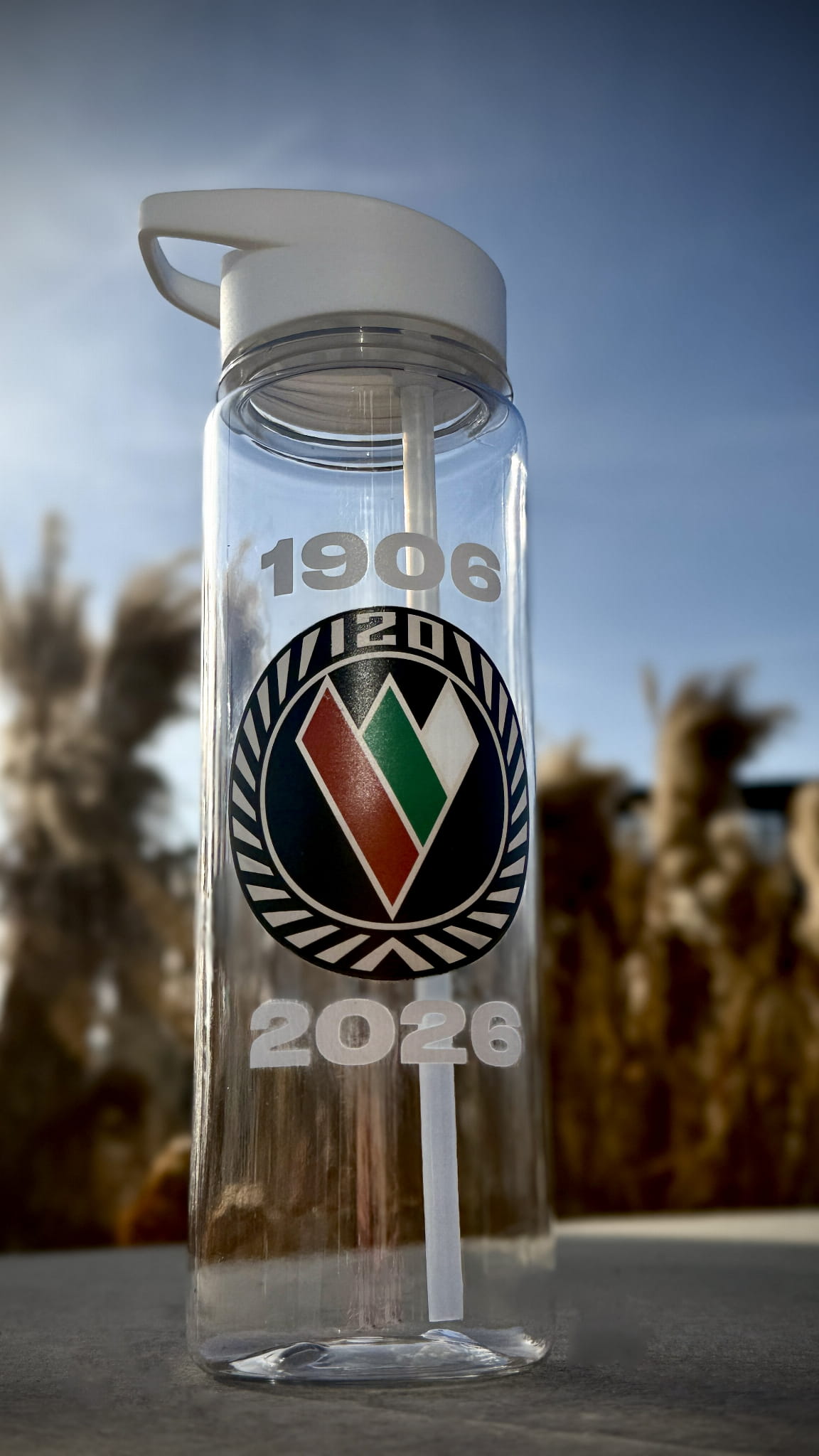 Bidon z jubileuszowym logo 120-lecia Zagłębia Sosnowiec, wyposażony w słomkę. Dostępny w dwóch wersjach kolorystycznych – z czerwonym lub białym zamknięciem. Świetny na trening, spacer czy do szkoły.