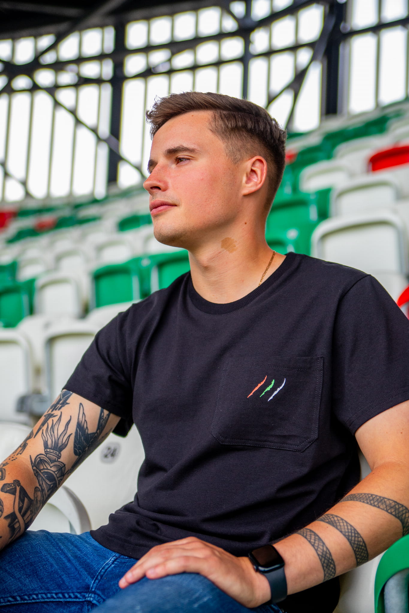 Koszulka Zagłębia Sosnowiec o klasycznym kroju i standardowej długości. Czarny model wyróżnia się minimalistycznym designem z trzema paskami w barwach Zagłębia na piersi, które podkreślają klubowy charakter i nawiązują do tradycyjnych kolorów klubu.